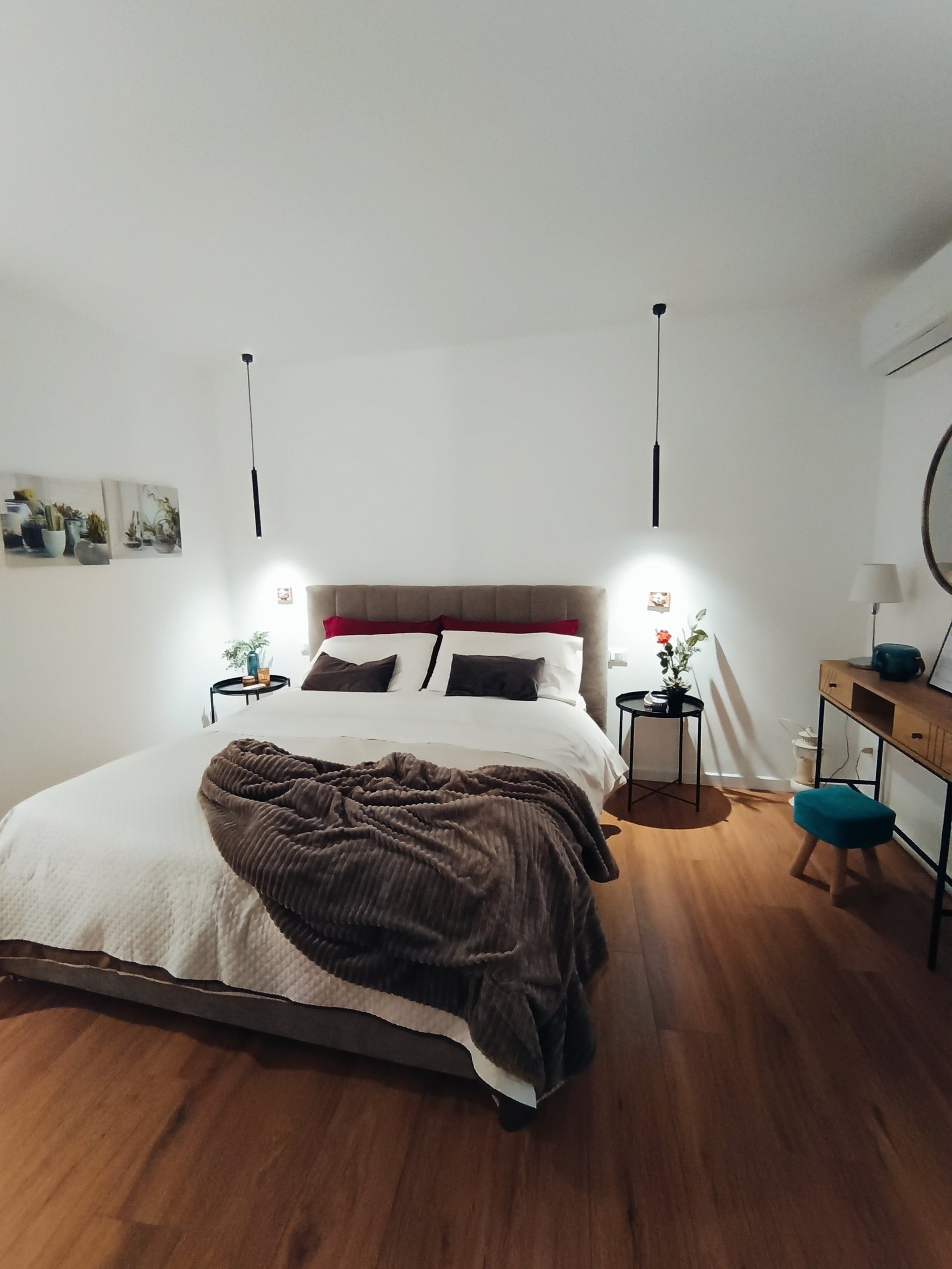 L'appartamento, climatizzato e ben arredato, comprende una confortevole camera da letto, un luminoso soggiorno con cucina attrezzata con utensili, frigorifero e bollitore elettrico, e un bagno completo di bidet e doccia. Gli ospiti troveranno asciugamani e lenzuola a disposizione, per garantire un soggiorno confortevole.